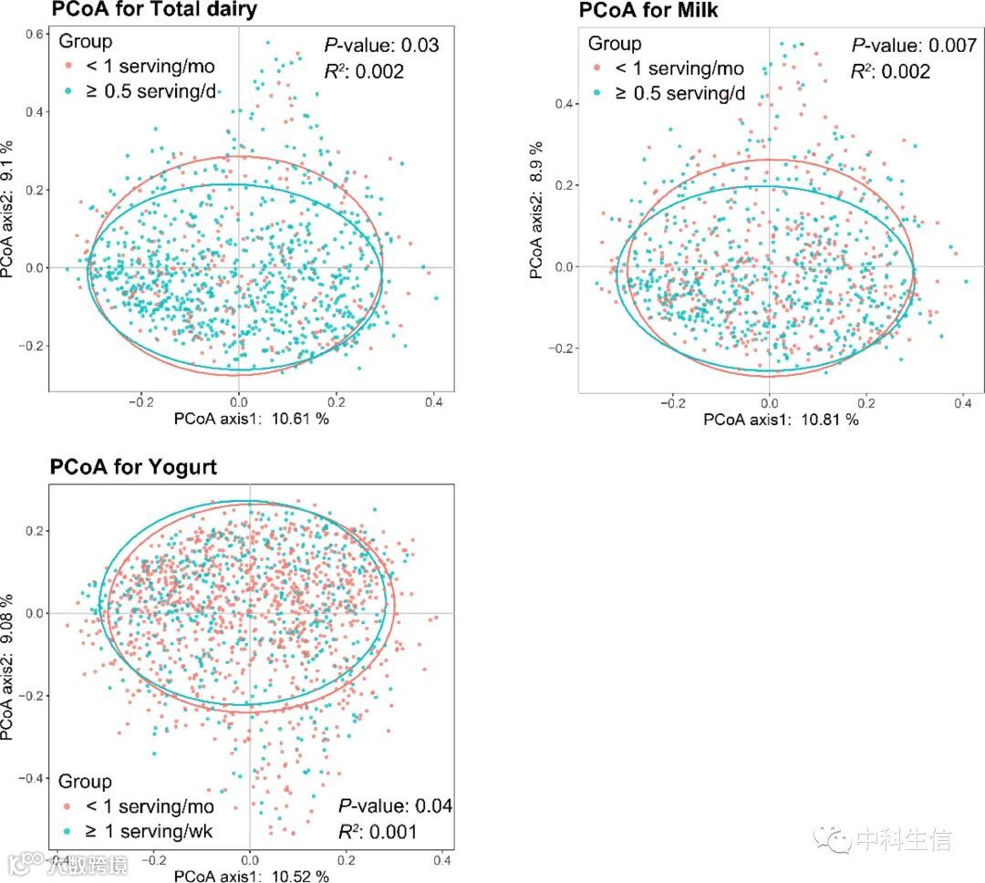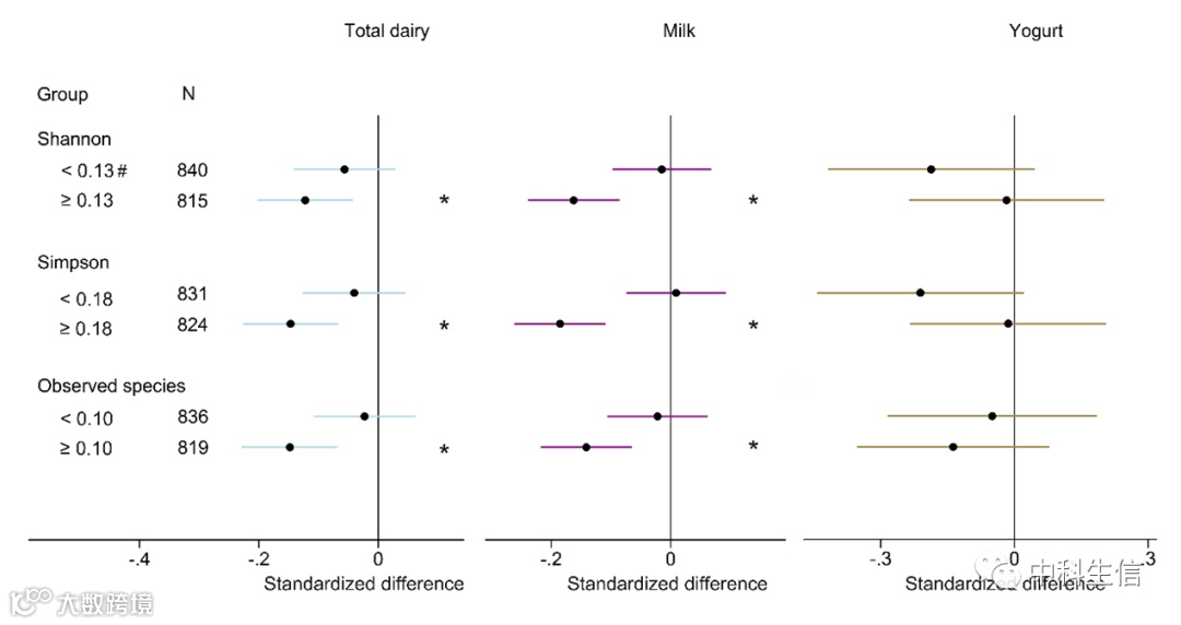研究首先分析了乳制品摄入量与 α 多样性指数之间的前瞻性关联,之后分析了乳制品最高和最低摄入量类别之间肠道微生物群落结构的总体差异。