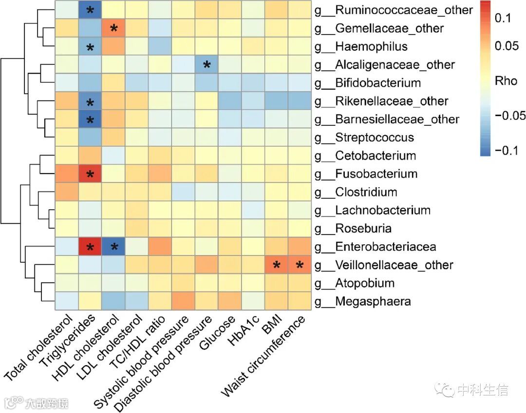 多变量线性回归分析表明,乳制品微生物总分、乳微生物分与高密度脂蛋白胆固醇呈正相关。此外,乳制品摄入量与相应的乳制品微生物评分之间的相关性在年龄性别或体重指数之间没有显著差异。甘油三酯与乳杆菌科其他属、嗜血杆菌属、巴氏杆菌科其他属和瑞典乳杆菌科其他属呈负相关,而与角杆菌属和梭杆菌属呈正相关。此外,高密度脂蛋白胆固醇与肠杆菌科其他属呈负相关,后者富含于总乳品和牛奶消费量较低的类别中。