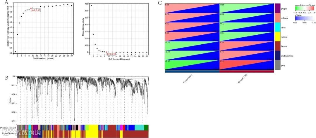 用R软件中的WGCNA包对上述差异表达基因进行进一步处理,建立无标度共表达网络(无标度R 2 > 0.8),软阈值幂为9(图3A)。通过建立共表达网络,将DEG 聚类成七个模块(图3B),计算每个模块之间的相关性,其中黄色模块(0.74,P < 0.0001) 是与 PAH 相关的最高的模块(图3C)。因此,黄色模块(597 个 DEG)就是与 PAH 相关的关键模块。