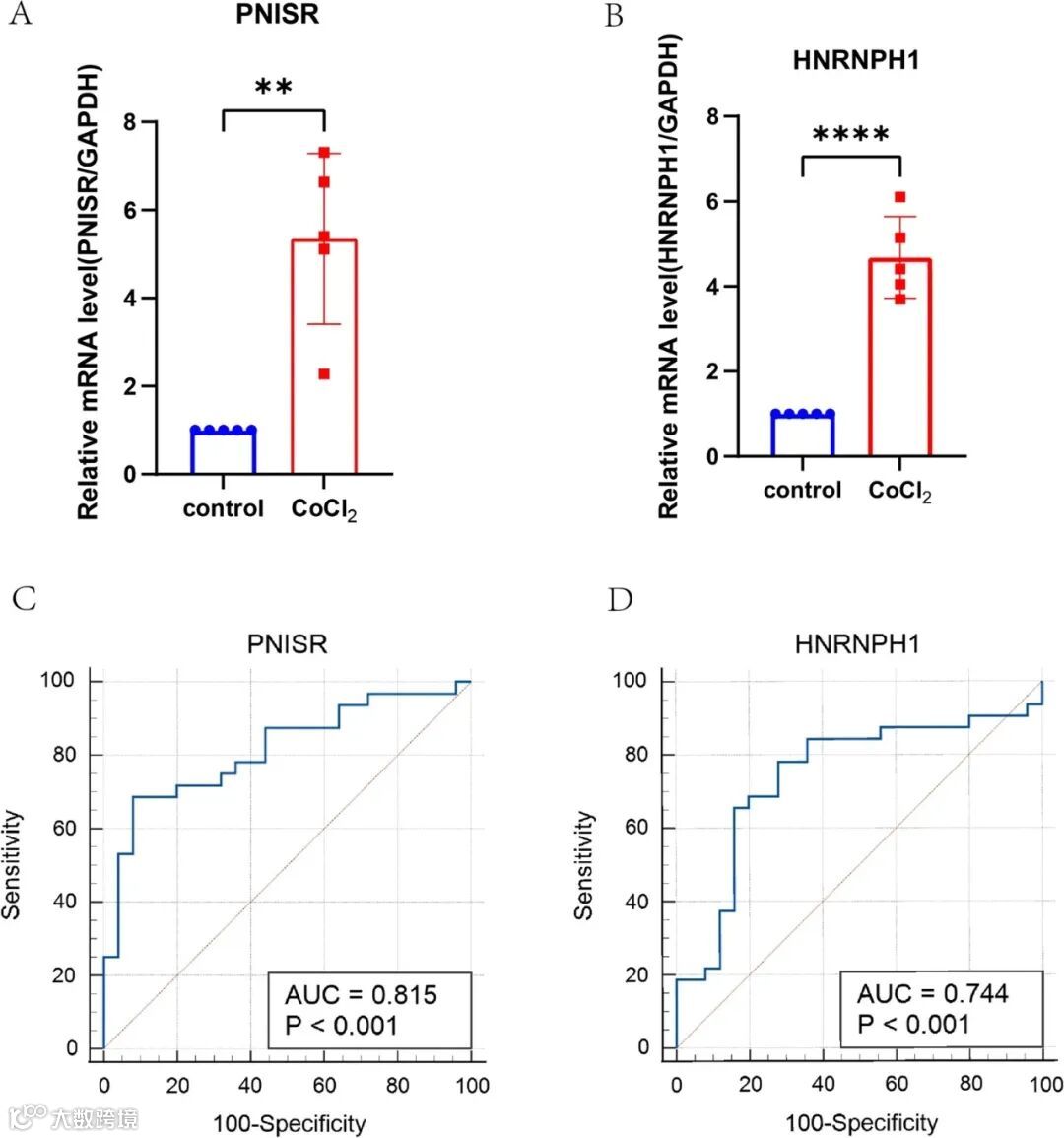 基于RT-qPCR 实验,对中枢基因PNISR和HNRNPH1进行验证。结果表明,与对照组相比, CoCl2处理组中PNISR和HNRNPH1的表达水平均上调,这与生物信息学分析一致(图7A-B)。为了评估PNISR和HNRNPH1区分CoCl 2处理组和对照组的能力,进行 ROC 曲线。结果显示,PNISR和HNRNPH1的 AUC分别为 0.815(95% CI 0.690-0.905;P < 0.0001)和 0.744(95% CI 0.611-0.850;P = 0.0005),表明已鉴定的中枢基因PNISR和HNRNPH1可能是 PAH 的新型生物标志物(图7C-D)。