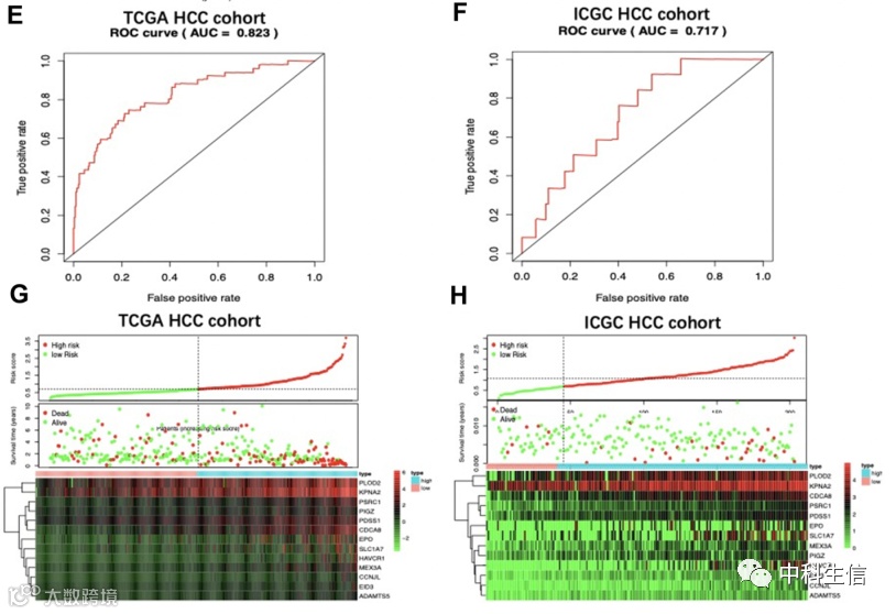 图 4 基于TCGA 肝细胞癌 (HCC) 队列和ICGC肝细胞癌(HCC)队列的预后特征与临床病理特征的相关性
