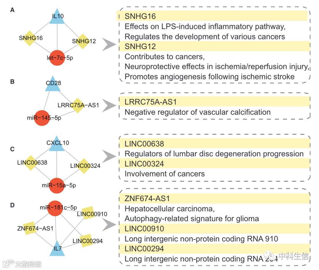 基于LMGCN网络,作者发现文献中已经验证了4个miRNA-mRNA关系对,分别为let-7c-5p/IL-10、18miR-145-5p/CD28 、19miR-15a-5p/CXCL10和miR-181c-5p/IL7。通过提取这4对miRNA-mRNA关系对的子网,作者发现了8个相连的lncRNA可能作为ceRNA来调控上诉miRNA基因对。通过查阅相关文献,作者总结了这些lncRNA主要与癌症发生、免疫过程和血管钙化等有关,尤其是SNHG16作为ceRNA参与了炎症和免疫过程,在子网中与IL10竞争(B细胞重要生长因子,将B细胞活化为抗体生成细胞),在MG发病机制中具有重要作用。这些发现IL10/SNHG16竞争关系对可能参与MG的发病机制。