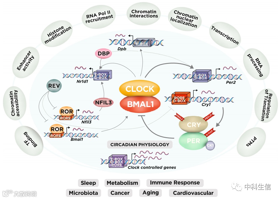 哺乳动物的昼夜节律基因网络和全基因组调控层。在网络的核心,转录因子CLOCK和BMAL1激活Per1、Per2、Cry1和Cry2基因(此处我们以Per2和Cry1为例),其蛋白质产物(PER和CRY)抑制自身的转录。PER和CRY蛋白由平行的E3泛素连接酶途径(FBXL3和FBXL21用于CRY,β-TrCP用于PER)翻译后调节,PER水平也由CK1调节。CLOCK和BMAL1还调节Nr1d1/2基因的表达,这些基因分别编码核受体REV-ERBα/β。这些核受体节律性抑制Bmal1和Nfil3的转录,这两个基因被维甲酸相关孤儿受体-α/β(RORα/β)激活。反过来,NFIL3与D-盒结合蛋白(DBP)以及时钟和BMAL1一起调节REV-ERBα/β核受体的节律。这三个互锁的转录反馈环调节着大部分的循环基因,导致从睡眠到新陈代谢和衰老的各种不同生理系统的节律。