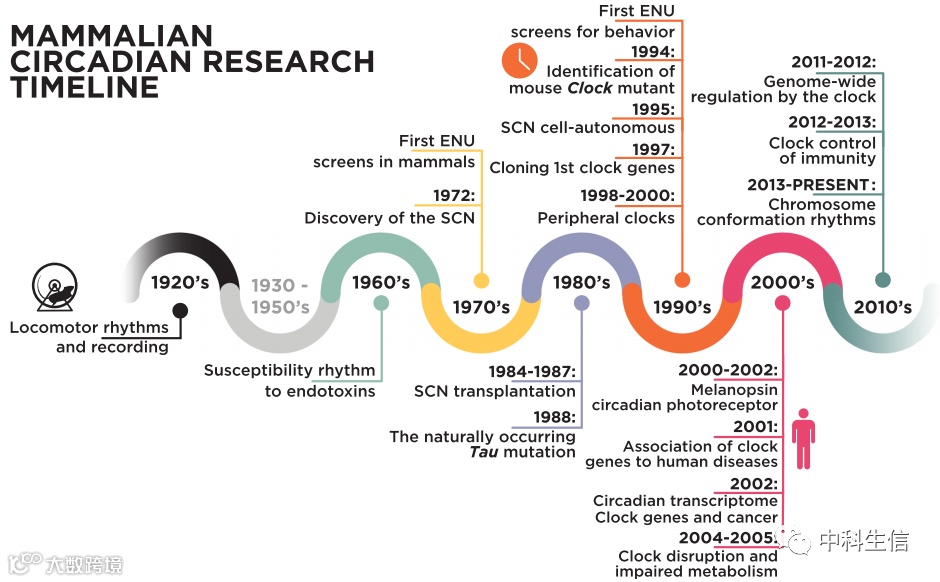 哺乳动物生物钟研究的主要发现的时间表。1920s:首次对大鼠的运动节律进行长期记录。1960年:冷泉港生物钟研讨会。首次观察到一天中的时间决定了对内毒素的易感性。1972年:损伤研究表明,下丘脑的视交叉上核(SCN)调节肾上腺皮质酮和饮酒行为节律。1970s-1980s:首次在哺乳动物中进行ENU (N-乙基-N-亚硝基脲)筛查以识别新的基因。1984-1990:通过移植实验确定SCN为主要调节因子。1988年:在仓鼠中发现了一种自然发生的昼夜节律Tau突变。1990s:第一个对哺乳动物的行为进行ENU筛查,识别出第一个哺乳动物时钟基因,Clock。1995年:在哺乳动物中,昼夜节律被证明是细胞自主的,并保留在分离的SCN神经元中。1997年:克隆了时钟基因,该基因被证明属于bHLH-PAS转录因子家族。同年,哺乳动物的PER1基因也被克隆,这两个基因都为识别哺乳动物昼夜节律的机制提供了切入点。1998-2000:发现BMAL1/MOP3作为CLOCK的伙伴,通过CRY进行抑制,以及CLOCK上的PER1/2-Cry1/2反馈环路:BMAL1,首次描述了外围的生物钟。仓鼠Tau突变体的克隆证实CK1ε是调节核心生物钟的一个重要激酶。2000s:黑色素被确认为视网膜中的昼夜节律光感受器。2001年:与人类疾病相关的时钟基因首次突变。2002年:首次在昼夜节律转录本中发现了一个重要的基因子集,它们具有24小时周期的周期性基因表达。2004-2005:时钟基因突变与新陈代谢受损的关联。2011年:据报道,过氧化物氧化还原蛋白周期与转录无关。2011-2012:时钟对全基因组调控的详细描述。2012-2013:我们对免疫时钟控制的理解取得重大进展。现在:我们对生物钟通过昼夜染色体组织进行全基因组调控的理解出现了一个新的层面。