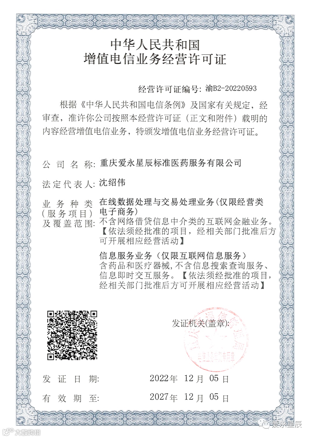 近日,重庆爱永星辰标准医药服务有限公司获得由重庆市通信管理局颁发的《中华人民共和国增值电信业务经营许可证》。