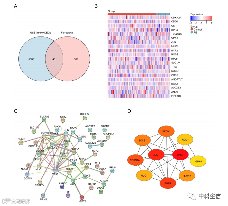 PE血液样本中铁死亡相关DEG的鉴定和候选铁死亡相关hub基因的鉴定(图3)。( A ) 铁死亡相关 DEGs 的维恩图。( B ) 描述前 20 个与铁死亡相关的 DEG 表达水平的热图。( C ) 铁死亡相关 DEG 的 PPI 网络分析。( D ) Cytoscape 中的 CytoHubba 插件选择了 10 个 hub 基因。