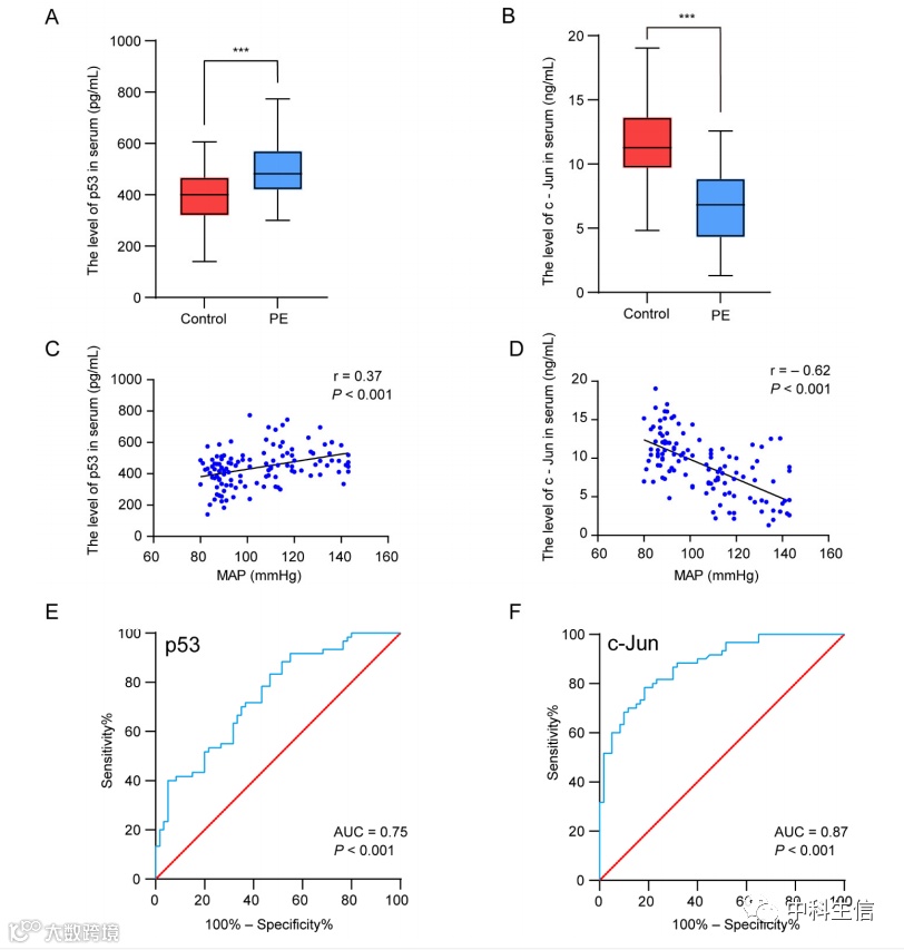 两个hub基因的实验验证,hub基因表达水平与临床特征的相关性分析,诊断准确性分析(图4)。( A , B ) 血清中 p53 ( A ) 和 c-Jun ( B ) 的浓度。( C , D ) MAP 与 p53 ( C ) 和 c-Jun ( D ) 之间的 Pearson 相关图。( E , F ) 绘制 ROC 曲线以检查 p53 ( E ) 和 c-Jun ( F ) 的诊断潜力。