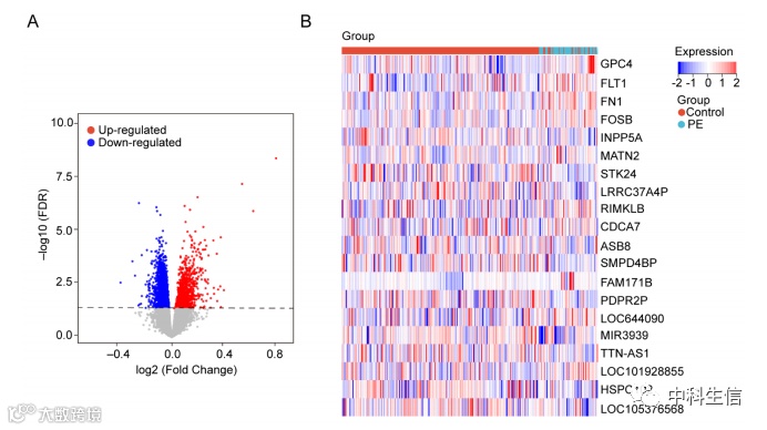 鉴定血液样本中的 DEG(图1)。( A ) 火山图。红点代表上调基因;蓝点代表下调基因;灰点代表无意义基因。( B ) 对照组和 PE 组 DEG 层次聚类的热图。