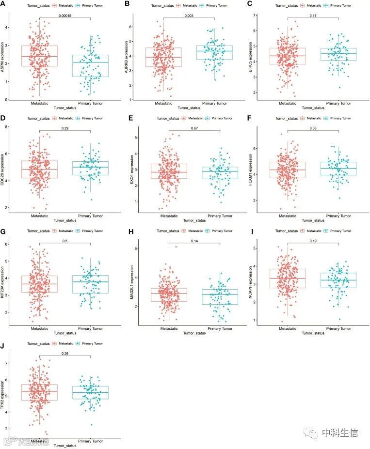 Kaplan-Meier分析显示10个Hub基因中有5个与预后显着相关。基于这5个Hub基因构建预后模型,并绘制预后模型的生存曲线。还用GEPIA2数据库对10个Hub基因的生存进行了预测。根据肿瘤的转移和原发状态将所有患者分为两组,转移组中ASPM的表达显着高于原发组,原发组中AURB的表达显着高于转移组。