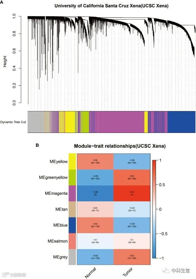 对来自UCSC Xena数据库和GSE3189的基因表达矩阵进行基因共表达网络分析。UCSC Xena和GSE3189分别鉴定了六和七个共表达模块。UCSC Xena中的magenta模块与GSE3189中的blue模块和分组特征之间的相关性最高。