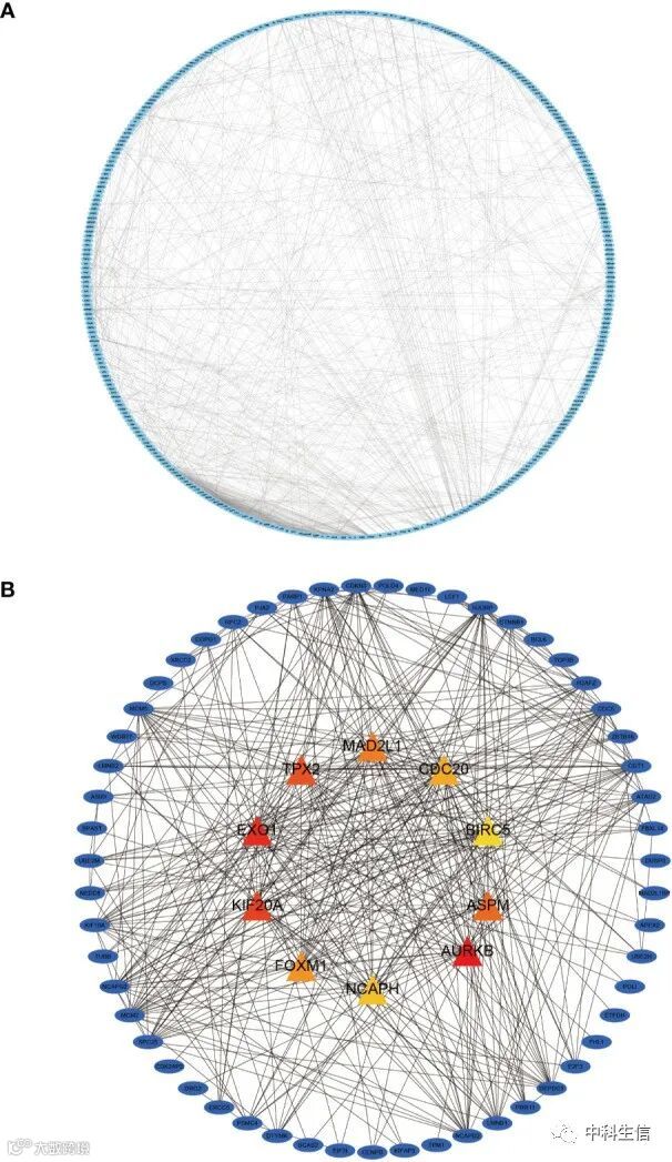 将435个基因导入STRING在线数据库以获得PPI网络。 随后,使用CytoHuba插件中的MCC算法得到10个Hub基因。