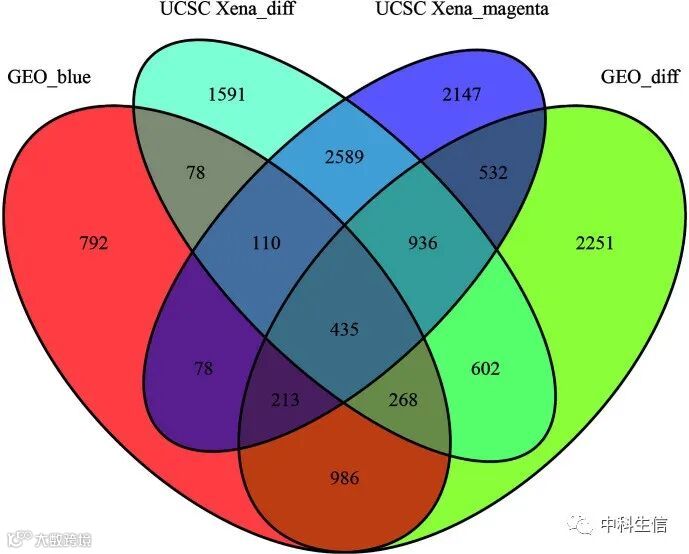 在UCSC Xena和GSE3198数据集中共识别出6609个和6223个DEG。UCSC Xena中magenta模块的基因、GSE3189中blue模块的基因,以及两个数据集的DEG,得到435个重叠基因用于后续分析。