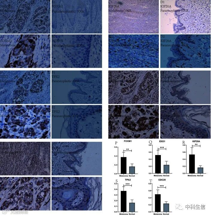 这5个基因在黑色素瘤中的免疫组化染色阳性率明显高于在黑色素瘤中的阳性率。