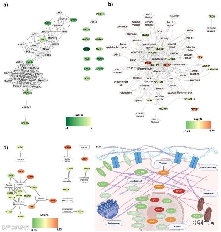 编码DERNA的综合特征在于它们的相互作用、组织表达和亚细胞定位(图4)。为此STRING数据库用于构建DERNA的相互作用网络,其中节点是蛋白质,边代表预测的功能关联。可以看出这些蛋白质分成三个主要网络,其中MUC20是其中两个网络的参与者(图4a)。使用NDEx数据库,还可以研究基因表达和细胞定位。肥胖男性SAT中的DERNA也在大量其他组织中表达。这些还包括神经特定组织,如海马、小脑和大脑皮层;与输卵管、子宫内膜、膀胱、精囊等泌尿生殖器官有关的组织;以及肌肉组织(例如骨骼肌、心肌)(图4b)。此外,在图4c中,可以观察到DERNA的亚细胞定位。大量细胞器出现,可能表明SAT细胞在细胞核以及细胞质、线粒体和细胞骨架中普遍存在差异表达,表明所有细胞功能发生了变化。