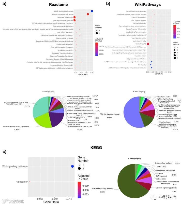 DERNA在三个数据库中进行了通路分析:Reactome、WikiPathways和KEGG。Reactome分析突出了53条重要途径。图 7e 报告了按重要性排列的前 20 条通路。WikiPathways 数据库中出现了 30 条通路。图 7f 报告了前 20 条通路。KEGG 分析仅突出了 1 条重要的通路,即 Wnt 信号通路。