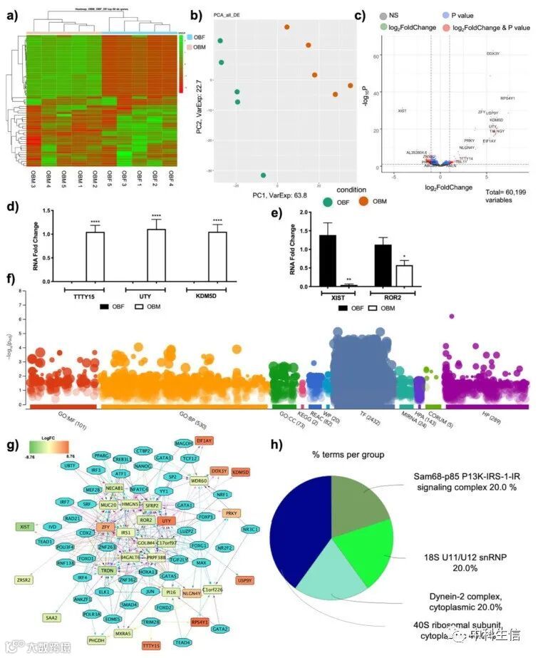 对OB-M vs. OB-F(|Log2FC| ≥ 1)的DERNA进行通路分析。GO分析中富集到101条分子功能通路 (MF)、530条生物过程通路 (BP) 和73条细胞成分通路 (CC)。通路分析,其中突出显示了KEGG的2个通路、Reactome的82个通路和WikiPathways的20个通路,以及DNA (TF) 中的2432个监管模式、miRNA 靶向的24个基因 (MIRNA),以及对蛋白质数据库的影响,例如蛋白质表达 (HPA, 143)、CORUM(5), 以及对表型的影响 (HP, 289)(图1f)。iRegulon 插件用于识别可能与 DE RNA 相互作用的转录因子(图 1g)。具体而言,47个转录因子与25个DERNA相互作用。
