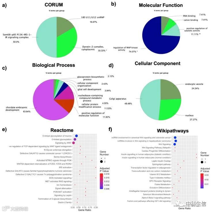 接下来专门研究了这些类别,发现3个 CORUM涉及Sam-68-p85 P13K-IRS-1-IR 信号复合物、细胞质动力蛋白-2 复合物和18S U11/U12 snRNP(图7a)。MF 中的 GO 分析显示了 49 条重要途径(图 7b)。ClueGO MF 分析显示了MAPK 活性(74.07%)、催化活性(11.11%)、阳离子结合和 RNA 结合(7.41%)(图 2b)。对于 GO BP 分析,出现了808个重要注释(图7c)。ClueGO分析中脊索胚胎发育中基因的影响最大(63.64%)。最后,GO CC 分析中出现了57个重要注释(图 7d)。