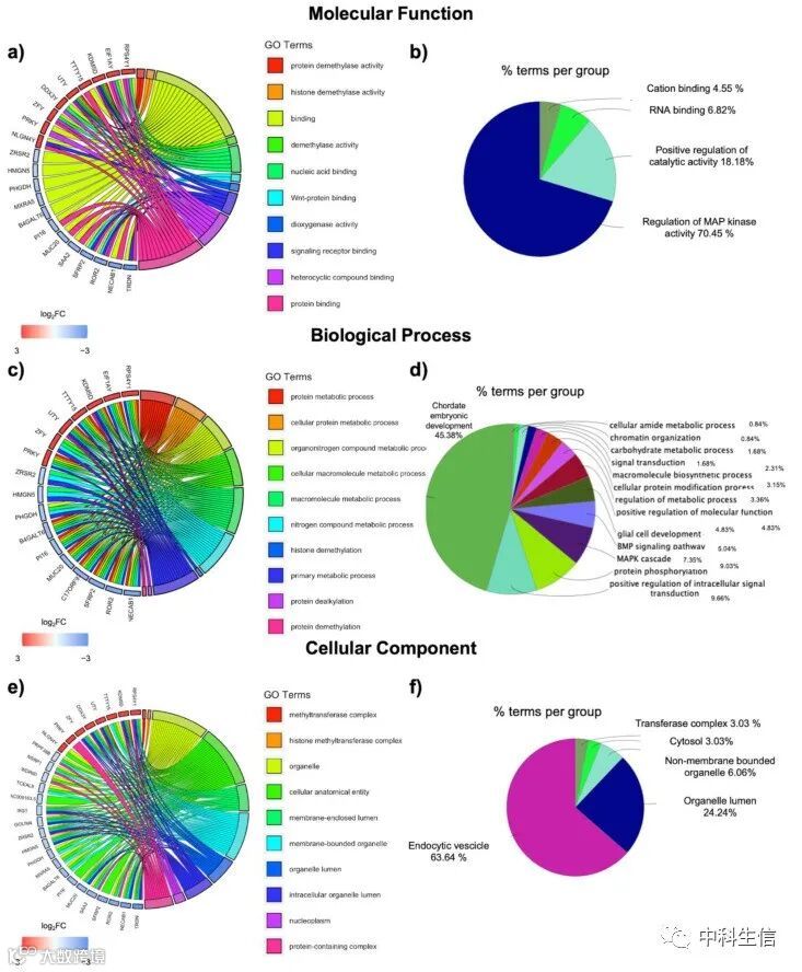 MF分析显示了101条重要途径,前10条显示为图2a中的GO弦图。ClueGO MF分析突出显示了“MAPK 活性调节”以及“阳离子结合”和“RNA 结合和催化活性”重要途径(图2b)。对于GO BP分析,出现了530个重要术语,前10个显示为图2c中的GO弦图。ClueGO分析突出了脊索胚胎发育中基因的意义(图 2d)。最后GO CC分析中出现了73个重要术语,前10个术语显示为图2e。ClueGO报告“内吞囊泡和细胞器腔”有重要意义(图 2f)。