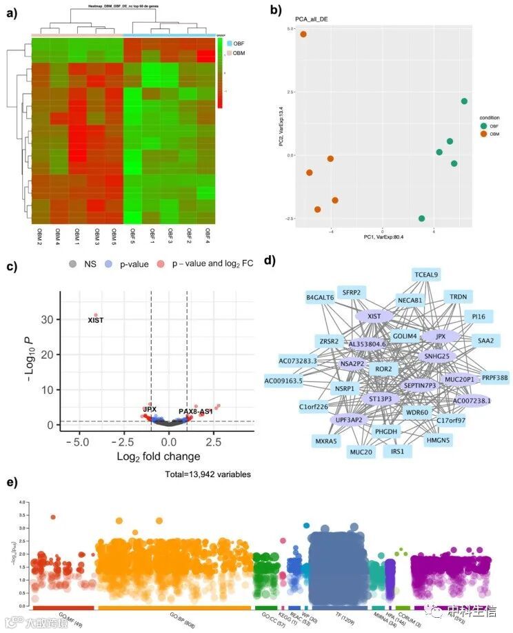 随着lncRNAs在性生物学和肥胖的背景下变得越来越相关,非编码DERNAs 得到了特别关注。事实上,非编码DERNA也呈现多样化的表达,如图6a热图和图6b中的PCA 聚类。火山图报告了非编码DERNA(图6c),19个非编码RNA 出现差异表达。使用LncRNADiseasev2分析了lncRNA对疾病的影响。调查它们在可能的并发症发展中的含义。AC10889.1、TTTY15、XIST、AC006157.1、PAX8-AS1、SNHG25和JPX主要参与了癌症的发展。有趣的是,除了 AC10889.1 和 AC006157.1 之外,其他 lncRNA 不仅与癌症有关,而且与神经退行性疾病(阿尔茨海默病和亨廷顿病)和精神分裂症有关。