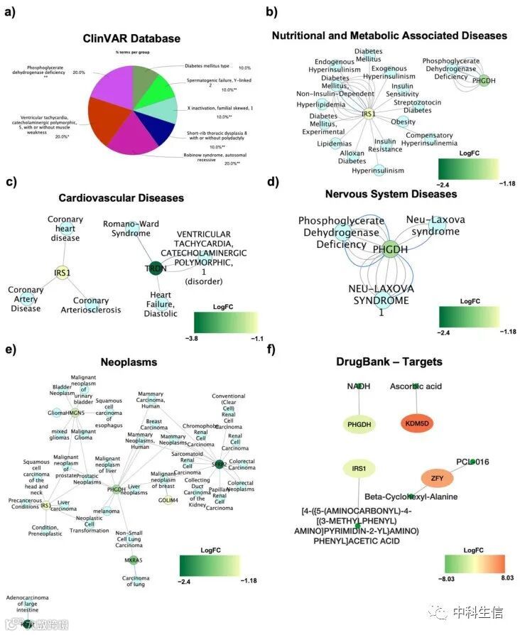 为了调查男性或女性可能出现的潜在继发性疾病,使用了ClinVar数据库。正如预期的那样,显示了与X或Y染色体相关的疾病(生精功能衰竭、Y连锁或X失活、家族性偏斜),还有代谢疾病,如2型糖尿病和磷酸甘油酸脱氢酶缺乏症(图5a)。这表明此处发现的遗传特征可能是继发性代谢并发症的发生原因,并且还会出现心力衰竭(室性心动过速)。DisGENE数据库将它们与疾病状况联系起来,按疾病类别细分。具体而言,IRS1和PHGDH作为导致营养和代谢相关疾病的DERNA,因为它们在糖尿病、血脂、肥胖 (IRS1) 和磷酸甘油酸脱氢酶缺乏症 (PHGDH) 中的相关性较大(图5b)。IRS1也参与冠心病的发展,而TRDN基因参与其他形式的心力衰竭、室性心动过速和Romano-Ward综合征(图5c)。PHGDH还负责神经遗传性Neu-Laxova综合征的发展(图5d)。最后,一些基因(HMGN5、IRS1、PHGDH、MXRA5、GOLIM4 和 SFRP2)与多种癌症类型的发展有关(图5e)。有趣的是,所有讨论的基因在男性中的易感基因表达降低,因此可以推测女性患者可能更容易发生相关病理。人们还关注性别选择性靶向DERNA的潜在药物(图5f)。事实上,出现了四个可以作为目标的特定基因,它们是PHGDH、KDM5D、IRS1和ZFY。