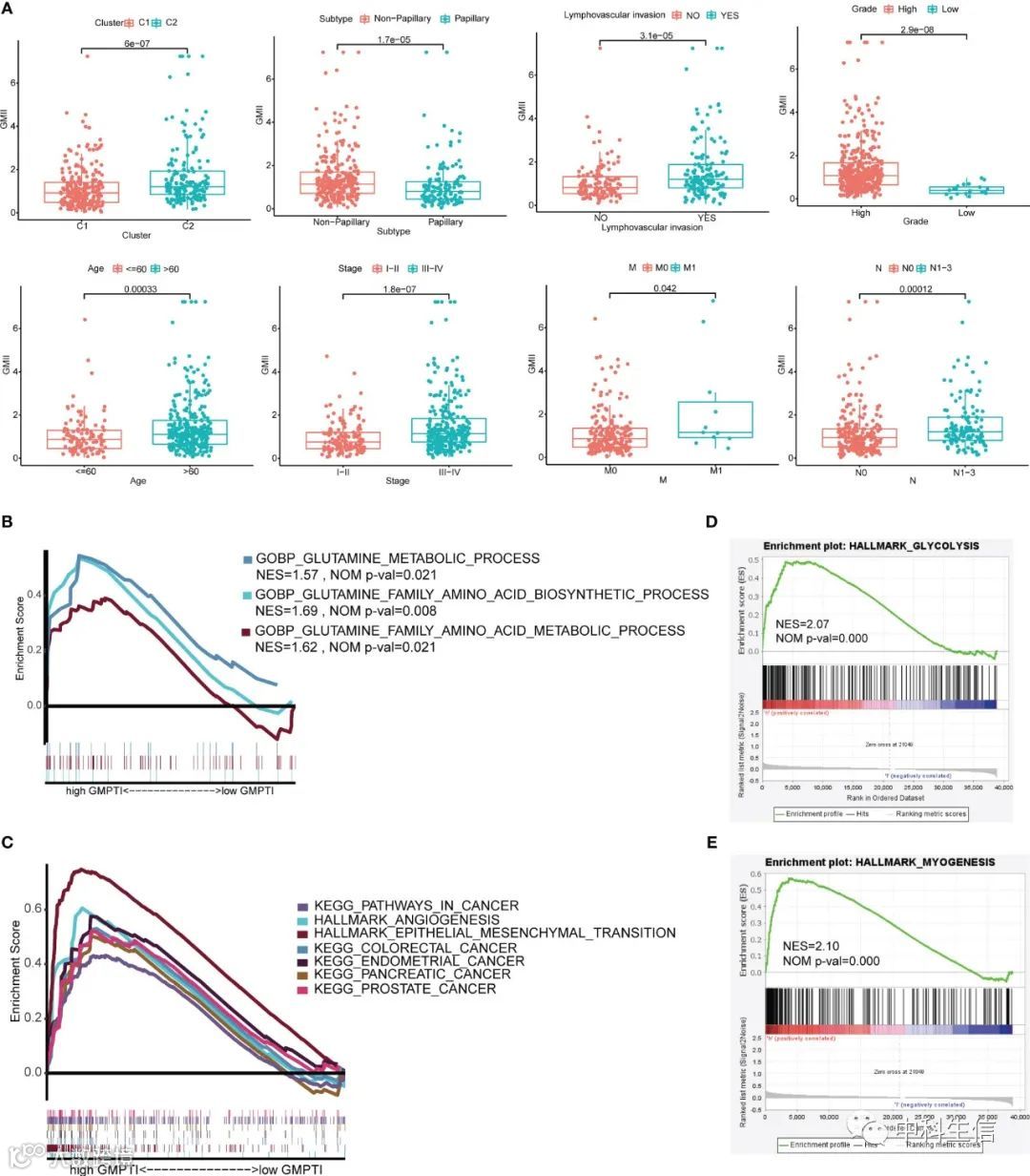 为了进一步验证GMII的临床意义,我们分析了不同临床特征组间GMII的差异。2组、非乳头状浸润、淋巴血管浸润、高级别、III-IV期、M1、N1-3期患者的GMII较高,提示GMII越高,肿瘤越晚期。。为了研究高GMII组中调控肿瘤发生的通路,我们进行了GSEA分析,结果显示,高GMII组在高谷氨酰胺代谢、谷氨酰胺合成和分解中显著富集。此外,高GMII组在癌变、血管生成和上皮-间充质转化(EMT)途径中显著富集(p为了进一步验证GMII的临床意义,作者分析了不同临床特征组间GMII的差异)。糖酵解和肌合成是高GMII组中NES最高的特征。