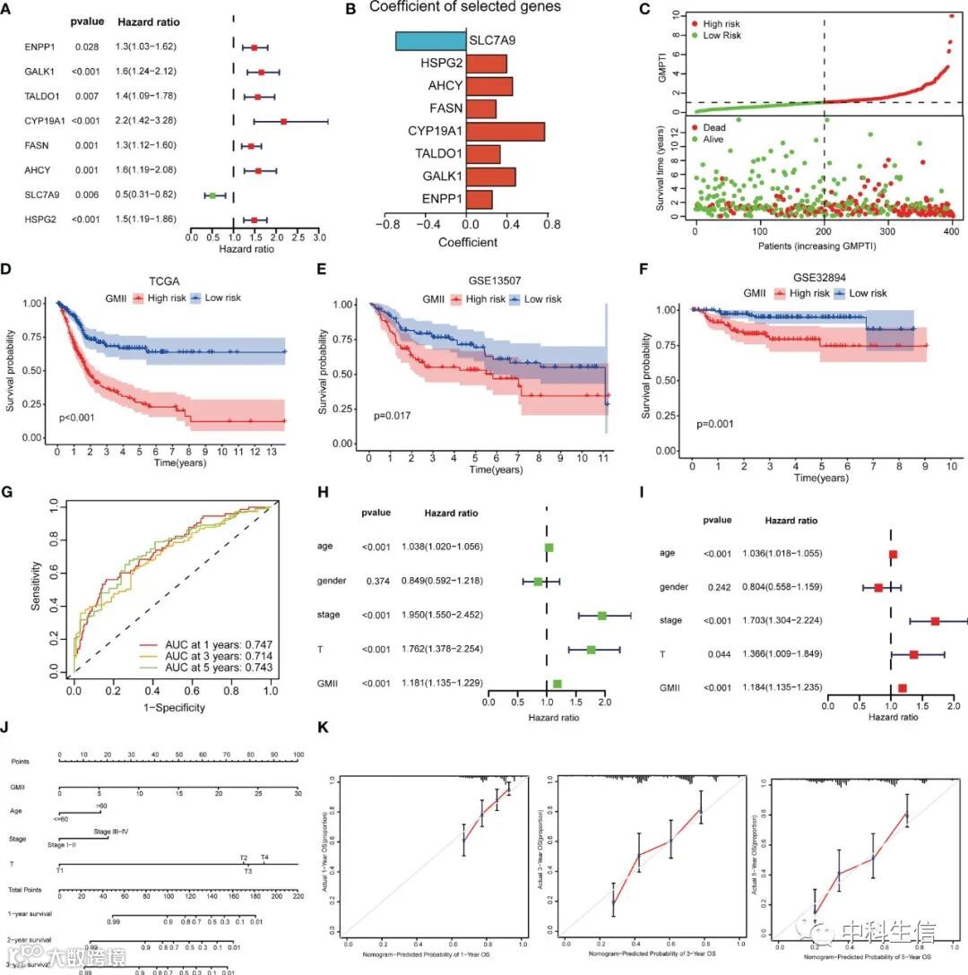 了构建与谷氨酰胺代谢及其衍生GMII相关的风险模型,我们通过单变量和多变量Cox分析确定了8个具有独立预后价值的基因来构建GMII。并通过外部验证集去验证。