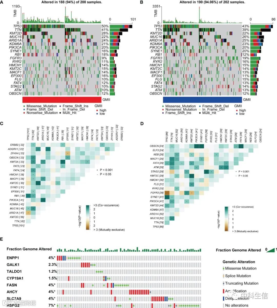 使用单核苷酸变异数据来研究高GMII组和低GMII组之间的基因组突变差异。TP53、TTN、KMT2D、MUC16、ARID1A是高GMII和低GMII群体中突变频率最高的前5个基因,但两种基因的突变频率存在差异。通过突变基因间的互斥合作分析,发现大部分基因之间存在突变协同作用,在high-GMII组中发现TP53-ARID1A和EP300-ZFHX4的突变互斥。在低GMII组中也发现TP53-FGFR3和KMT2D-FGFR3存在显著的突变互斥。另外,在cBioPortal数据库中检测到GMII中8个基因的突变率,发现突变率较低。
