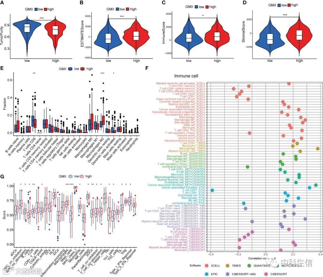 估计算法发现,高GMII组的肿瘤纯度较低,而有较高的估计评分、免疫评分(图和基质评分。CD8T细胞水平high-GMII组明显低于low-GMII组,和免疫抑制M2型巨噬细胞的水平增加在high-GMII组,表明high-GMII组有更高的免疫抑制活性和促进肿瘤进展。我们使用不同的软件发现了GMII和多种免疫细胞之间的相关性。ssGSEA算法结果显示,高GMII组比低GMII组具有更高的免疫细胞浸润和免疫相关功能和通路。