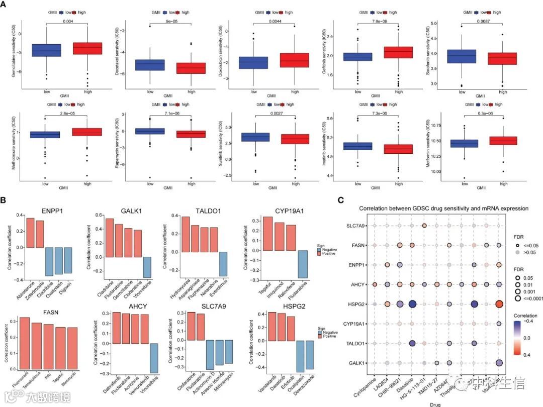 许多常见的膀胱癌化疗药物在高GMII组间有显著性差异。吉西他滨作为膀胱癌最常见的化疗药物,低-GMII组的半抑制浓度值明显低于high-GMII组,提示吉西他滨在低-GMII组可能有更好的疗效。从cellMiner数据库中分析GRGs与药物敏感性的关系,绘制基因与药物敏感性相关性最高的前5种药物的直方图。正相关表示基因表达越强,对药物越敏感,负相关表示基因表达越强,对药物的耐药性越强。其中,FASN表达的上调可能导致患者对大多数药物的敏感性增强。此外还利用GDSC数据库分析了用于构建GMII的8个grg的药物敏感性与mRNA表达之间的关系。