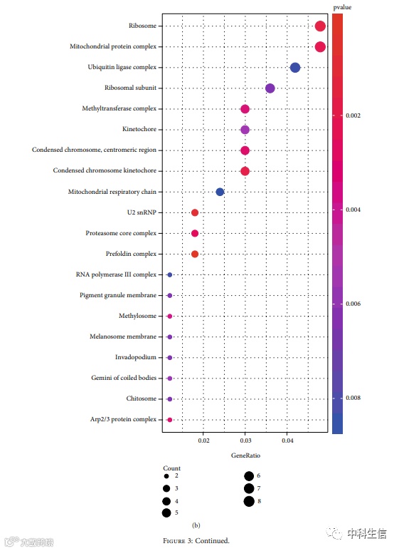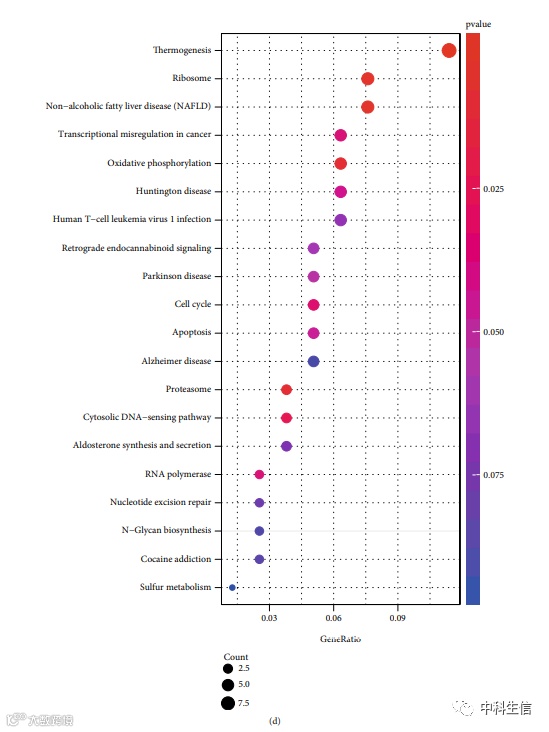 GO和KEGG的功能富集分析(图2)。(a) 生物过程。(b) 细胞部分。(c) 分子功能。(d) 在钢蓝模块中KEGG通路分析。