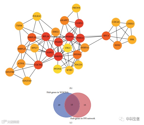 WGCNA鉴定的钢蓝模块和Cytoscape的共同hub基因(图3)。(a) 将钢蓝模块的176个基因导入STRING数据库,构建PPI网络。(b)通过Cytoscape中cytoHubba插件的degree方法鉴定出30个hub基因。(c) 在PPI网络和共表达网络中选择真正的hub基因。