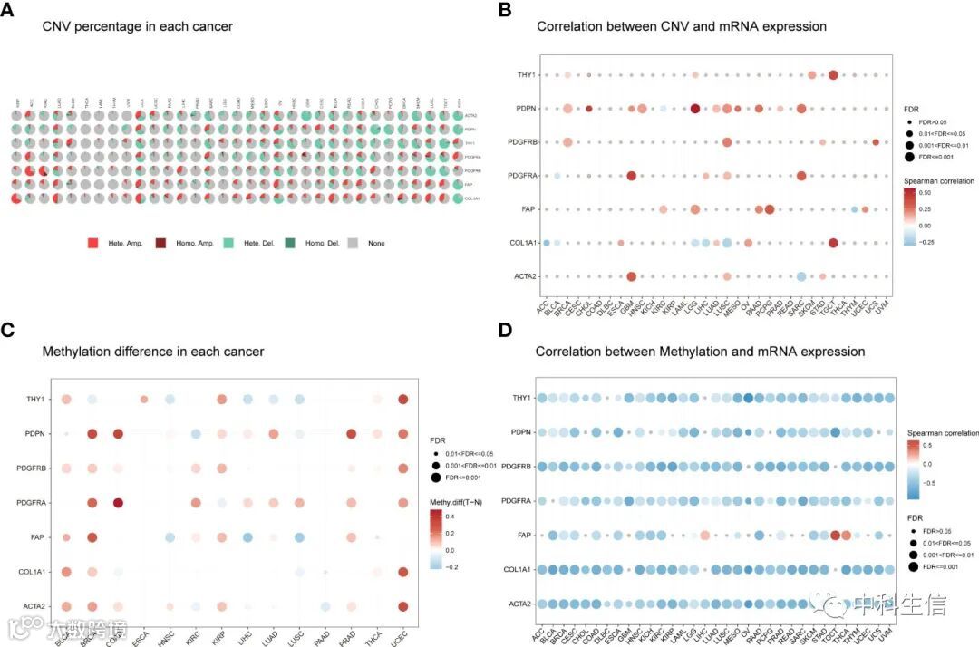 采用了七种经典的 CAF 分子标记,包括血小板衍生生长因子受体 α (PDGFRA)、血小板衍生生长因子受体-β (PDGFRB) 、α-平滑肌肌动蛋白 (ACTA2、α-SMA)、thy-1 细胞表面抗原 (THY1)、podoplanin (PDPN)、成纤维细胞活化蛋白 (FAP)和胶原蛋白 1A1 (COL1A1)进行拷贝数分析。这些 CAF 标志物的 SNV 频率为 100%(850 个肿瘤中的 850 个)。其中,PDGFRA 在 CAF 标记中具有最高的突变率 (34%)。在皮肤皮肤黑色素瘤 (SKCM) 中,COL1A1 突变最为普遍(71%)。