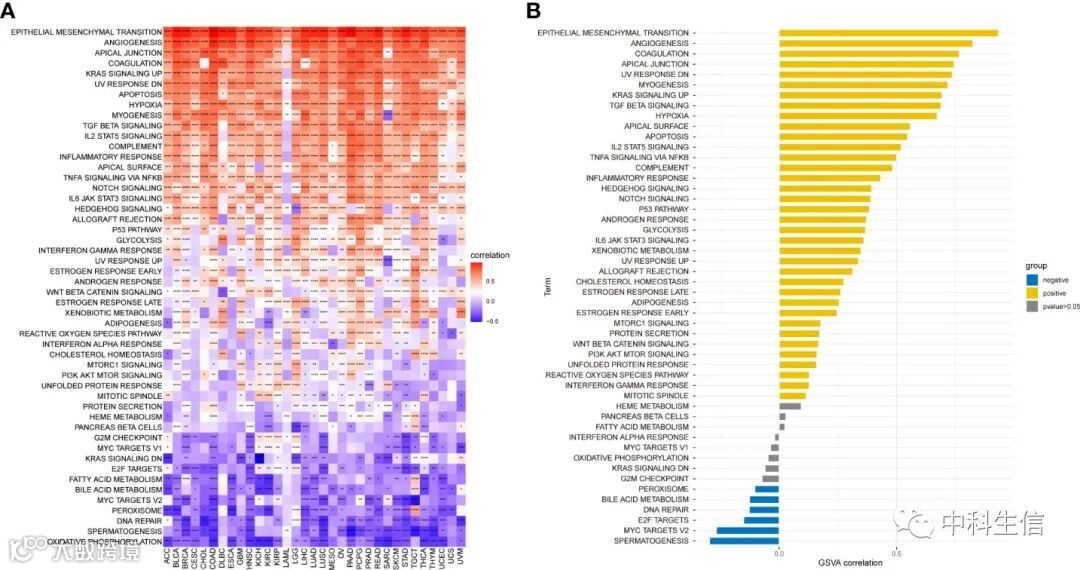 使用GSVA进行分析以确定 CAF 环境中的通路如何参与泛癌,结果表明,CAF 评分与上皮间质转化、TGF-β 信号传导、IL2-STAT 信号传导、缺氧、炎症反应和 IL6-JAK-STAT3 信号传导等途径呈正相关。
