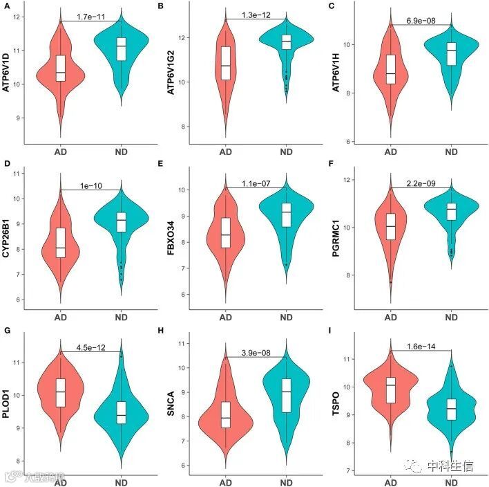 从GSE132903中鉴定了481个差异表达基因(图2A),并绘制了前20个差异表达基因的热图(图2B)。去除异常样本并过滤基因后,GSE132903中5000个基因和195个样本用于构建加权基因共表达网络(图3A、B) ,获得了11个共表达模块(图3C)。选择相关系数绝对值最大的MEturquoise模块进行进一步分析。最终获得了9个与铁代谢和AD相关的hub基因(图4A)。TSPO和PLOD1在AD中高表达,其他7个基因在在AD中低表达(图5)。