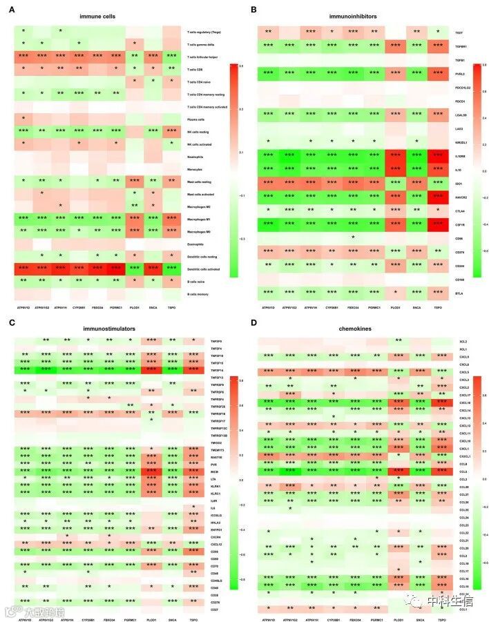 通过CIBERSORT算法估计了AD样本和ND 样本中22个免疫细胞的比例(图8A)。比较了AD和ND样本的免疫细胞浸润(图8B)。分析了hub基因与免疫浸润(图9A)、免疫抑制剂、免疫刺激剂和趋化因子(图9B-D)的关系。