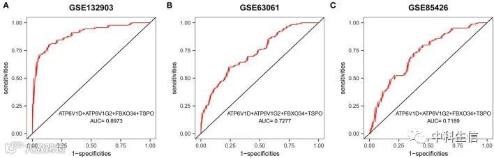 使用逐步回归分析结果表明,由ATP6V1D、ATP6V1G2、FBXO34和TSPO构建的预测模型具有良好的诊断性能,AUC为0.8973(图7A)。然后在血液样本GSE63061和GSE85426中进一步验证该模型,AUC分别为0.7277和0.7189(图7B,C)。