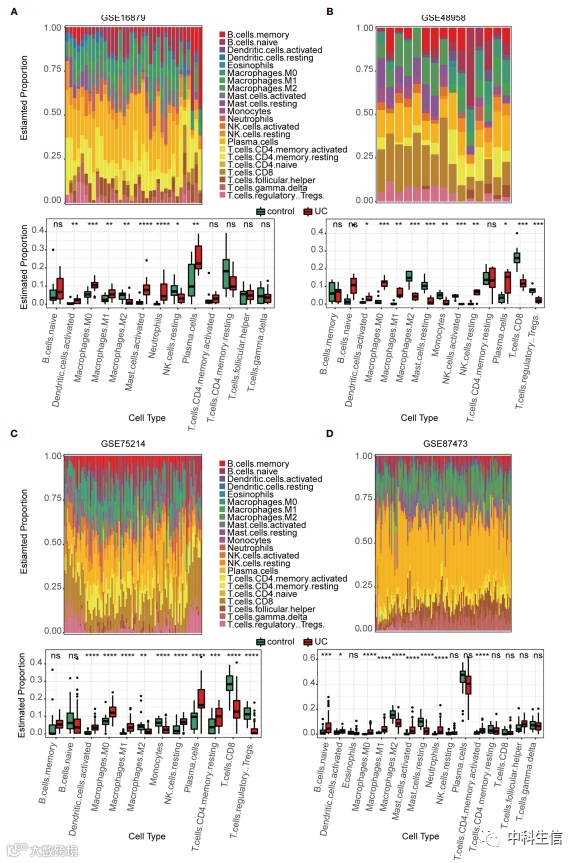 使用 CIBERSORT 算法在训练数据集中探索了免疫环境。结果显示,在所有训练数据集中,活性UC组织被较高比例的活化DC和巨噬细胞(M0和M1)和较低比例的M2巨噬细胞浸润(FDR<0.05),而其他免疫细胞表现出异质性。