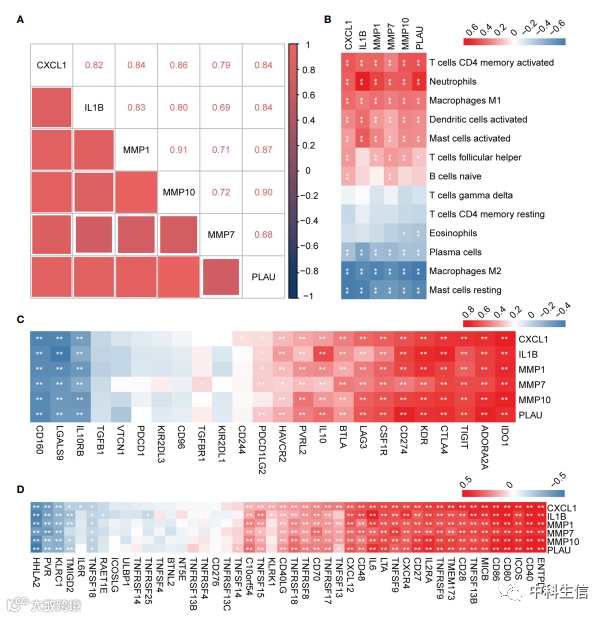 在验证集中分析hub基因的表达相关性,以及hub基因与免疫细胞、免疫抑制和免疫刺激因子的相关性。