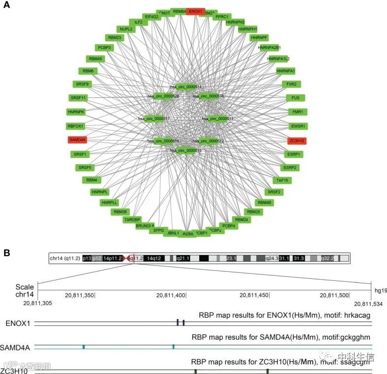 图9A为circRNA-蛋白质网络。图9B显示了 has_circ_0000515与ZC3H10、SAMD4A和ENOX1结合的位点和数量。