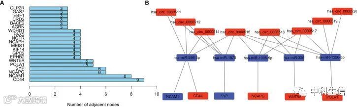 PPI网络中相邻差异基因交互节点≥5的基因被认为是hub基因:WNT5A、POLA1、SYP、NCAPG、NCAM1和CD44(图5A)。hub基因的ceRNA子网络包含8个circRNA、5个miRNA和6个mRNA(图 5B)。
