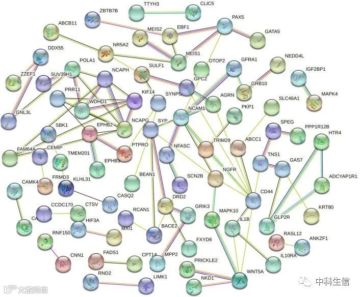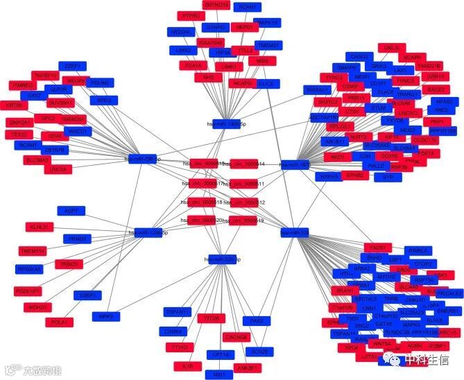 circRNA-miRNA-mRNA网络包括8个circRNA、6个miRNA和162个mRNA(图3)。图4构建一个PPI网络,包括151个受miRNA调节的差异表达基因。