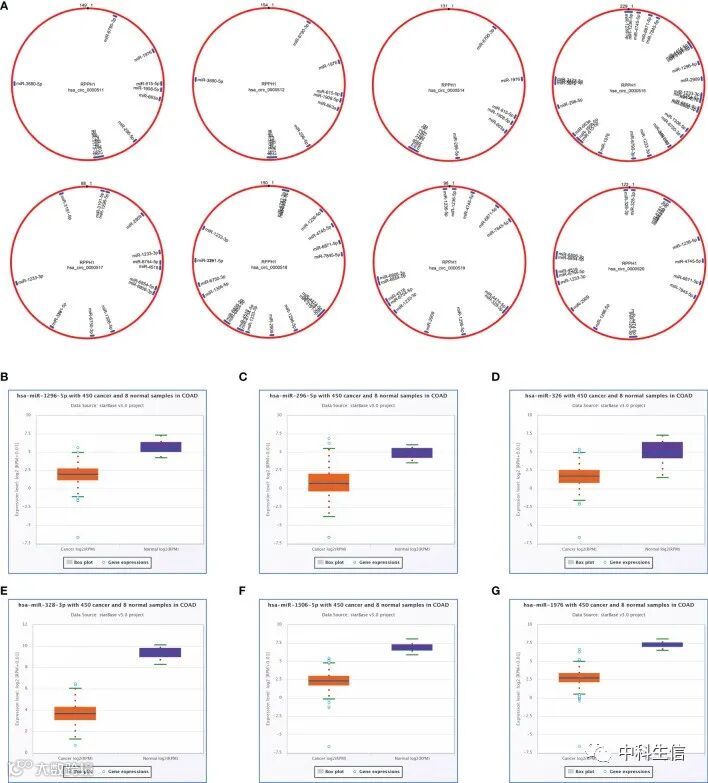 从GSE126094确定了321个DEcircRNA(图1A)。鉴定了源自RPPH1基因的8个circRNA(图1B)。图1C显示了这8个circRNA与miRNA和RBP的竞争性结合位点。circMIR1.0预测了circRNA结合的miRNA和相应的结合区域(图2A)。在TCGA数据集中鉴定出6个下调的 miRNA(图2B-G)和7877个DEmRNA。