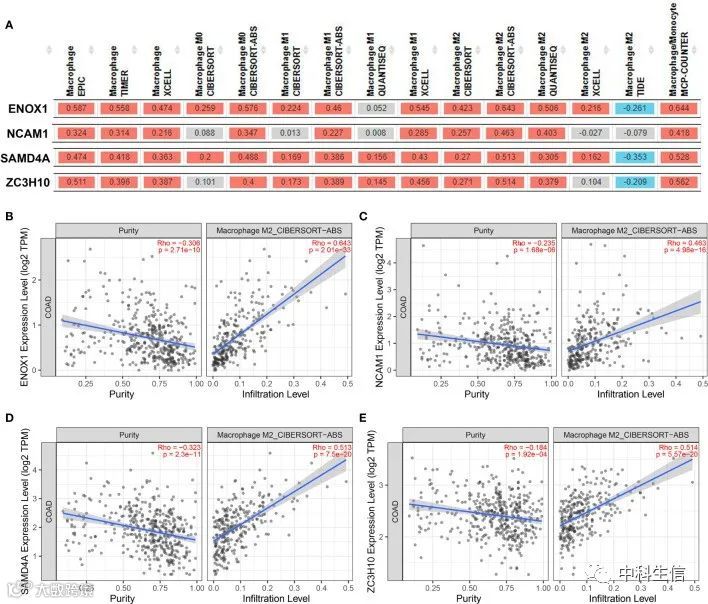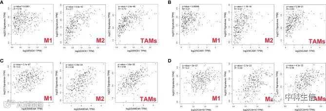图10为ENOX1、NCAM1、SAMD4A和ZC3H10的表达与M1巨噬细胞、M2巨噬细胞和TAM之间的相关性。