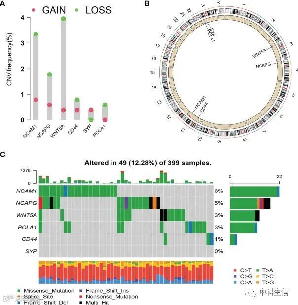 WNT5A的CNV突变频率达到4%,主要是CNV缺失(图8A)。12.28%的样本有hub基因突变,其中大部分是错义突变(图8C)。