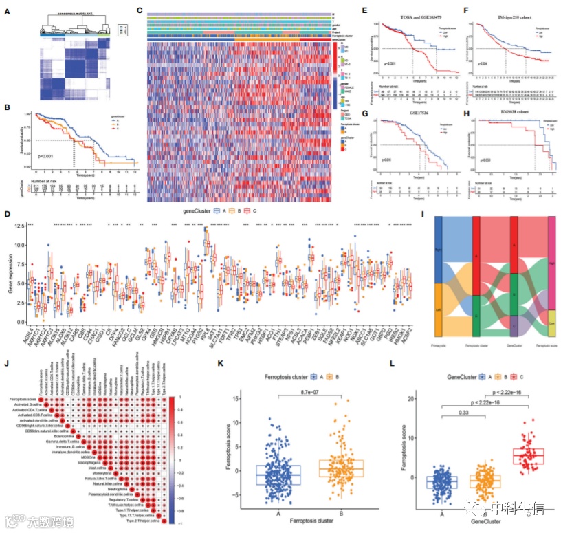 使用 R 包“Limma”获得了在两簇之间获得8,087 个与铁死亡表型相关的 DEG。鉴于 LCC 和 RCC 之间的明显差异,我们分析了 LCC 和 RCC 中的 DEG。经过交集分析,得到了508个重叠的DEGs。进一步,基于 508 个重叠的 DEG 进行了无监督聚类分析,并将患者分为三个与铁死亡表型相关的 DEG 簇(基因簇 A-C)。其中,基因簇 A 中的患者预后最好。