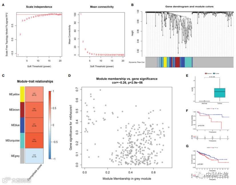 7.为了确定 LCC 和 RCC 中与铁死亡相关的关键预后基因,基于 DEG 和 FS 的交集进行了加权基因共表达网络分析(WGCNA)。
