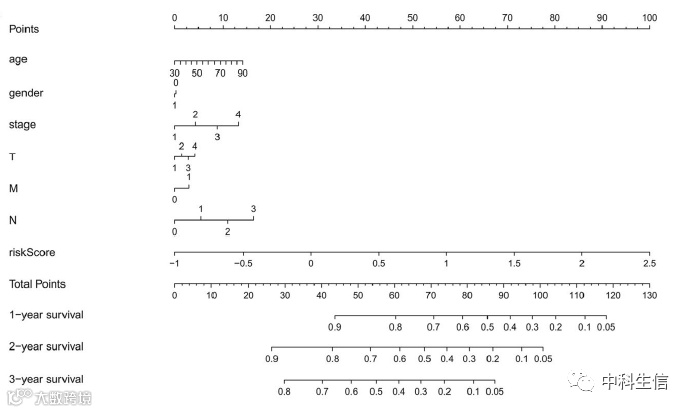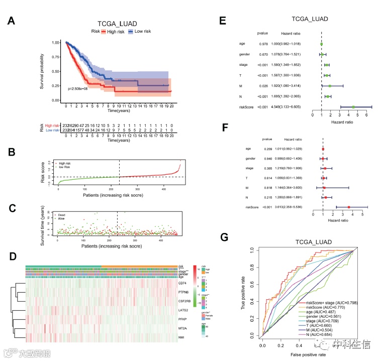 分别对LUAD高低风险组进行Kaplan-Meier 生存曲线分析,风险评分分布和相关的生存状态也表明较高的风险评分有更多的死亡机会,热图中显示了这两个风险组中七个筛选的干扰素γ反应基因的表达水平,ROC曲线分析TCGA LUAD 队列中 3 年生存预测和临床特征包括年龄、性别、分期(T、N 或 M),单多变量Cox 回归分析验证TCGA LUAD 队列中患者总生存率的独立因素,列线图(Nomogram)构建预后风险模型。
