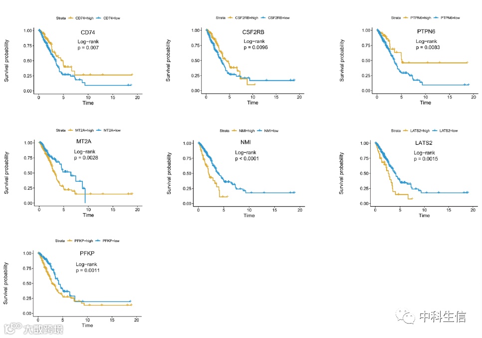 使用单变量cox回归模型,我们分析了TCGA队列中24个干扰素γ反应基因的预后价值,再通过LASSO回归模型验证,我们鉴定了7个差异基因。之后,我们分别对LUAD高低风险组进行7个基因的Kaplan-Meier 生存曲线分析,CD74、CSF2RB或PTPN6的高表达与良好的预后相关,而MT2A、NMI、LATS2或PFKP的高表达与LUAD的不良预后相关。