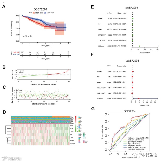 为了独立确认风险特征,我们将七基因预后特征应用于 GEO 数据库 ( GSE72094 ) 中的独立肺癌队列。