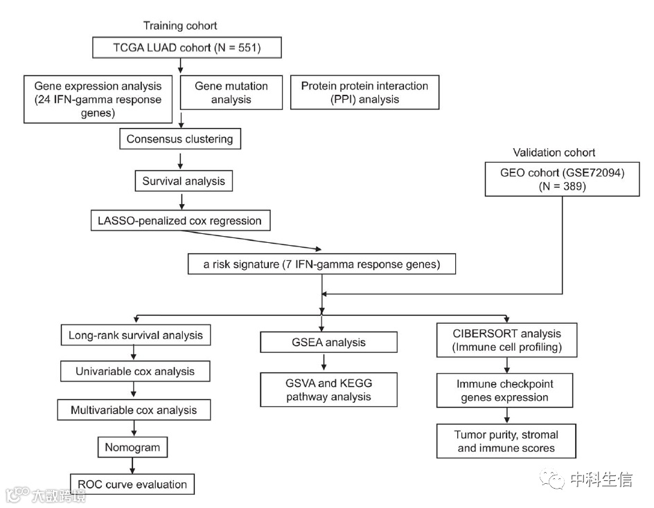 早!今天小编和大家分享一篇发表在Aging杂志上的文章(IF:5.683),题目为Seven interferon gamma response genes serve as a prognostic risk signature that correlates with immune infiltration in lung adenocarcinoma。该文章通过筛选肺腺癌γ干扰素应答基因构建预后风险模型。